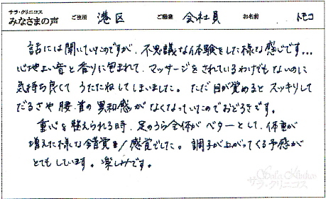 話には聞いていたのですが、不思議な体験をした様な感じです…。 心地よい音と香りに包まれて、マッサージをされてるわけでもないのに 気持ち良くて うたたねしてしまいました。ただ目が覚めるとスッキリして