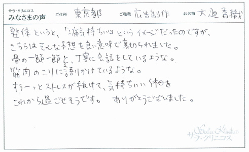 |若返りの整体 サラ・クリニコス TOPページ|初めての方へ|喜びの声|プロフィール|施術の流れ| コースと料金|よくあるQ&A|アクセス | どんなセラピー?|こんな夢をみたのです|どうして初回無料?|サラ・クリニコスを選んだ理由|インテリア| 完全返金制|向いてない方|施術目的 | サラ・クリニコスの意味|あなたも「癒し手」に!|サロン概要|西洋医学顧問|賢いあなたの選び方|リンク集|相互リンク|プライバシーポリシー| サイトマップ| よくある名前の間違い|