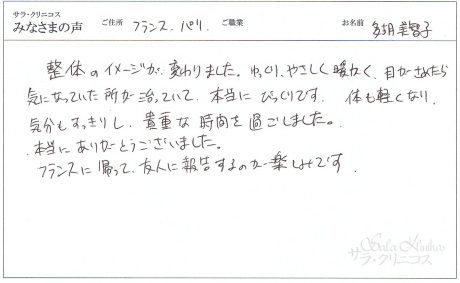 整体のイメージが変わりました。ゆっくり、やさしく、暖かく、目がさめたら 気になっていた所が治っていて、本当にびっくりです。体も軽くなり、 気分もすっきりし、貴重な時間を過ごしました。 本当にありがとうございました。 フランスに帰って、友人に報告するのが楽しみです。